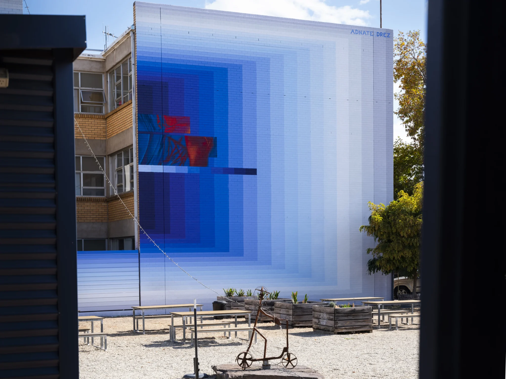 Drez expanded on his Chromatic Pulse series by using wider lines along the sides and finer bands at the top and bottom of the mural, creating space for an immersive field of colour that expands outward while drawing the viewer in. Soft blue and purple hues reflect the surrounding sky, while bordering grey tones echo shifting daylight, together visually connecting the work to its environment and integrating it with nature’s cycles. Deeper purples at the mural’s centre introduce a focussed depth for Adnate’s portrait. The colour strips that Drez created, foster a unified visual dialogue between both works.