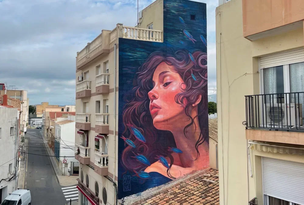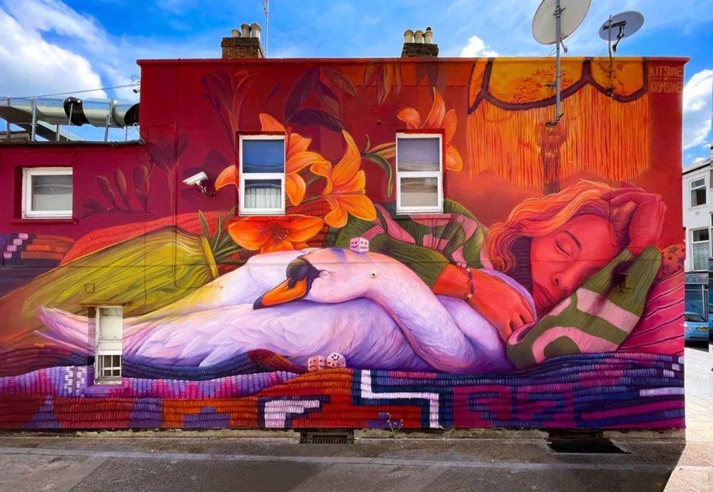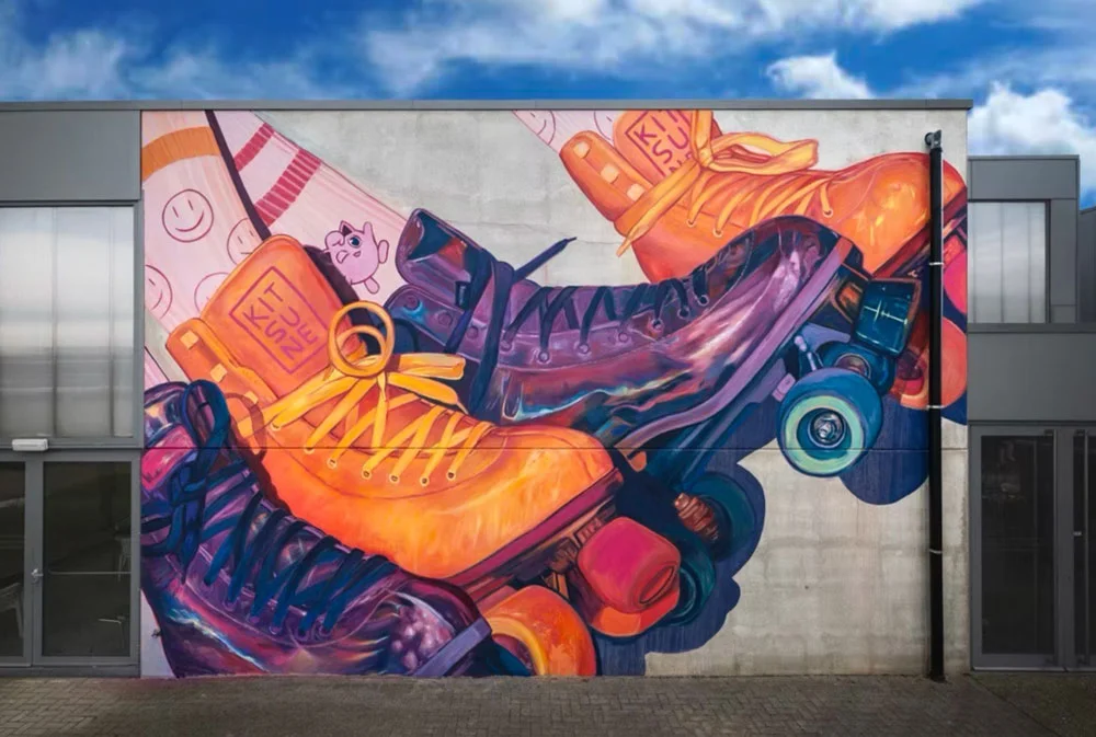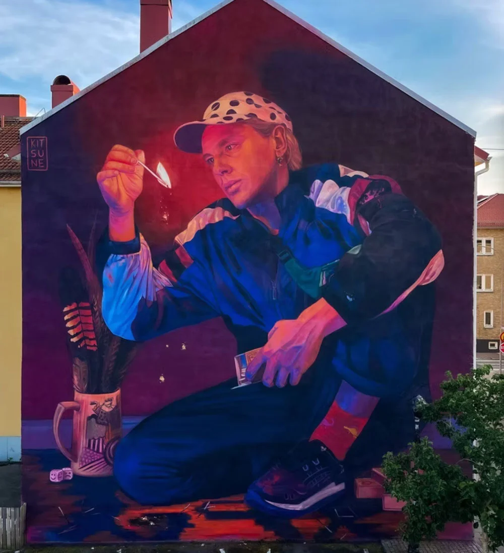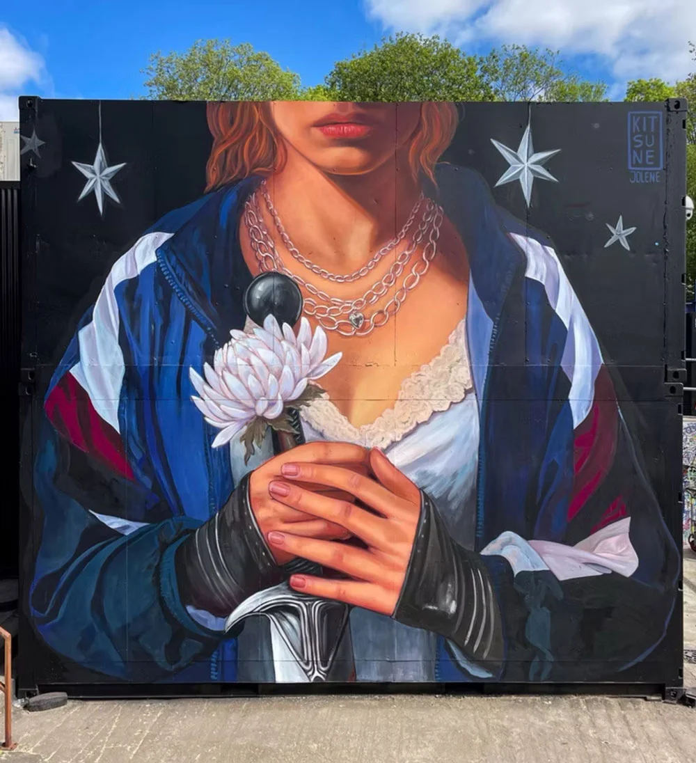 Kitsune Jolene is a Belgian-born contemporary mural artist working between Australia, Europe and around the world. Her practice sits within surreal figurative muralism, often blending symbolic figures with botanical forms and strong emotional narratives. Using her bold, recognisable colour palettes and flowing compositions, her work explores themes of transformation, intimacy, and the human relationship with nature. Influenced by psychological surrealism and poetic storytelling, Jolene creates immersive large scale works that feel both dreamlike and grounded. Her murals aim to invite quiet reflection while maintaining a strong visual presence within public space.
